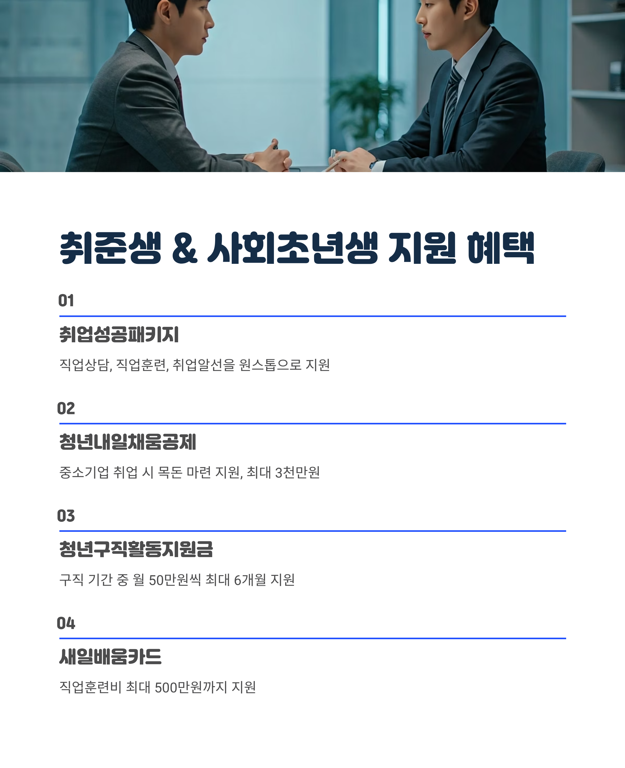 | 국민취업지원제도 | 취업을 희망하는 청년 (소득/재산 요건) | 구직수당(월 50만원) + 취업지원 서비스 |